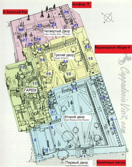 План — схему всего дворцового комплекса Топкапы можно посмотреть на сайте, где все описано на русском языке.